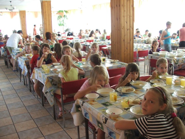Питание в лагере «Зеленый Шум» находится под контролем врача и диетсестры. Они тщательно следят за технологией приготовления блюд и качеством поставляемых продуктов. В лагере определено пятиразовое питание (завтрак, обед, полдник, ужин, поздний ужин). Меню, утвержденное Роспотребнадзором, отличается разнообразием и сбалансированностью ингредиентов. В рационе обязательны рыбные и мясные блюда, свежая выпечка, овощи и фрукты, молочные продукты. В лагере работают профессиональные повара, еда готовится по домашним рецептам. Они учитывают пожелания и вкусы детей и при желании обязательно выдают добавочную порцию. Питание детей проходит в уютной столовой, в двух просторных обеденных залах.
